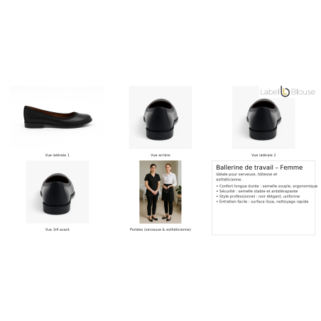Ces ballerines noires ont été conçues pour répondre aux exigences des métiers nécessitant de longues heures debout et de la mobilité constante. Leur semelle souple et leur coupe ergonomique garantissent un confort optimal tout au long de la journée.