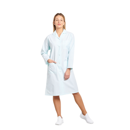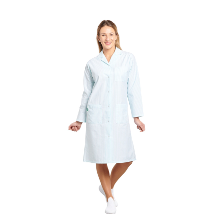 La blouse travail femme Mado est dotée de trois poches plaquées, dont deux poches basses et une poche poitrine, permettant un accès facile aux outils nécessaires durant les interventions. La finition rayée verte ajoute une note distinctive à cette tunique médicale, sans compromettre le sérieux de votre Tenue professionnelle femme Tenue professionnelle femme.