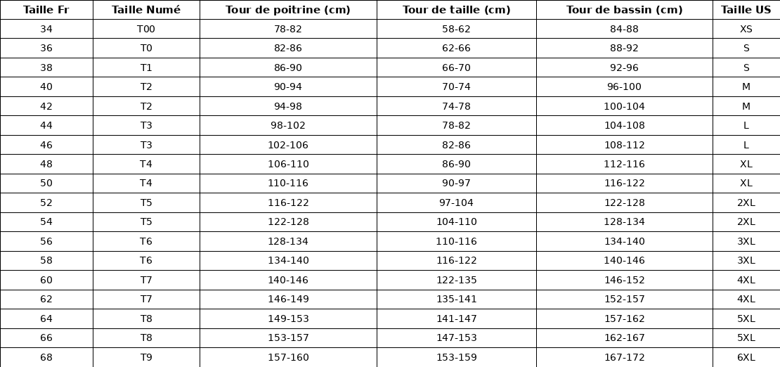 Tableau de Guide des Tailles correspondance