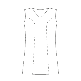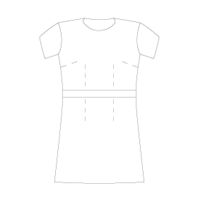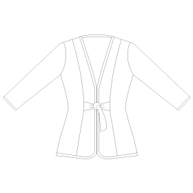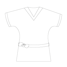 Tunique col «V», manches courtes forme kimono. Passant de chaque côté pour accueillir une écharpe-ceinture, fente d’aisance en bas. Hauteur 75 cm.
