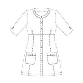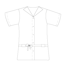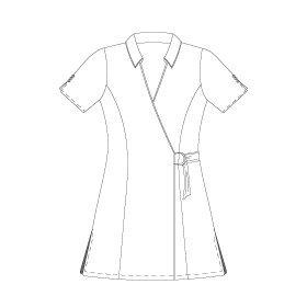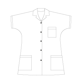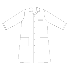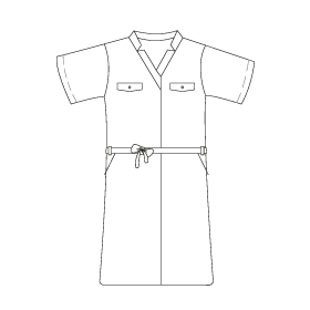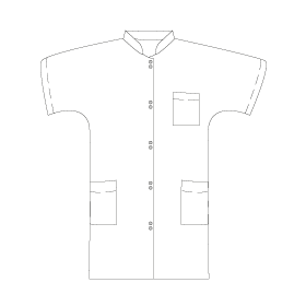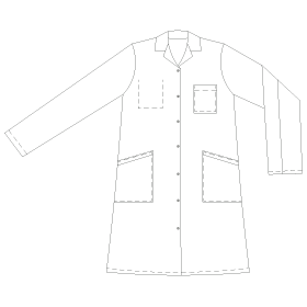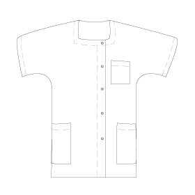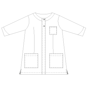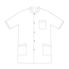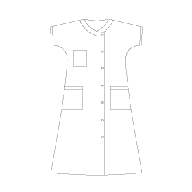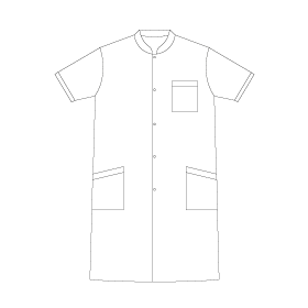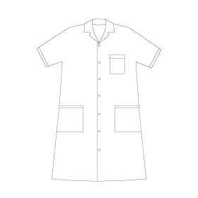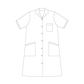 Blouse col ras-de-cou, manches courtes montées. Boutonnage par pressions calottées. 2 poches côtées. Hauteur 105 cm.