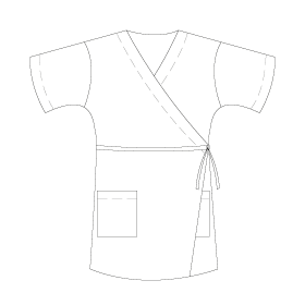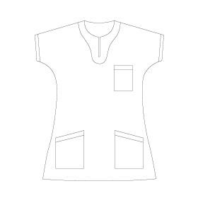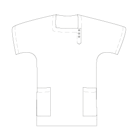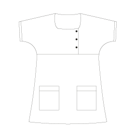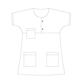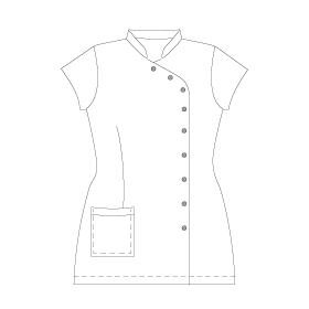 Tunique ras de cou , forme caraco , boutonnage pressions inoxydables sur épaule gauche, manches courtes kimono, 3 poches, hauteur 75 cm. Excellent maintien au lavage.