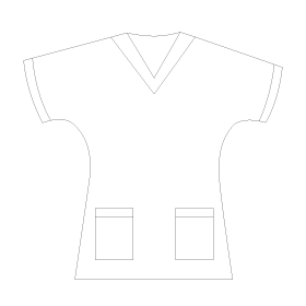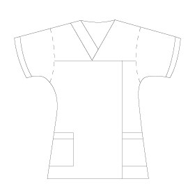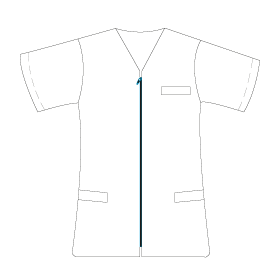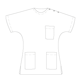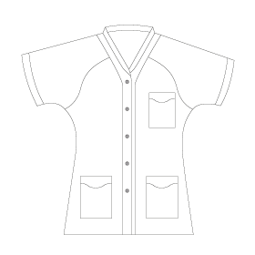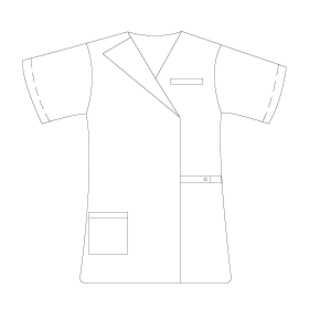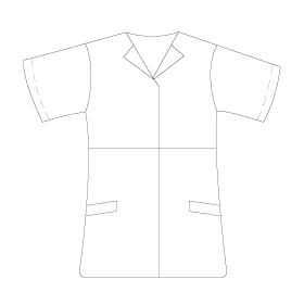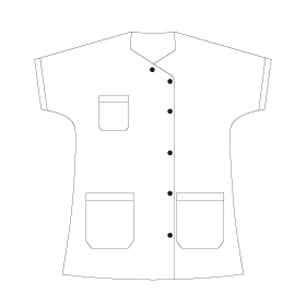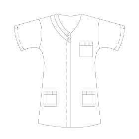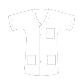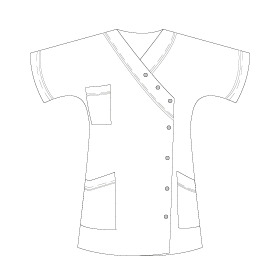 Tunique encolure en V. Avec incrustation rapportée, manches courtes forme kimono, 2 poches. Hauteur tunique : 75 cm. Boutonnage pressions calottées inoxydables.