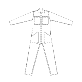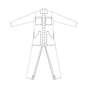 Combinaison simple métal, empiècement poitrine, élastique dos, 2 poches poitrine à glissière, 2 poches basses, 1 poche arrière, 1 poche mètre, passe-mains, poignets droits, empiècements dos et devant.