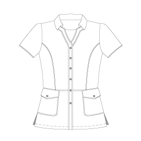 Blouse col officier manches courtes, 3 poches et poche intérieur. Boutons pressions inoxydables. Fente dos. Longueur : 115 cm.