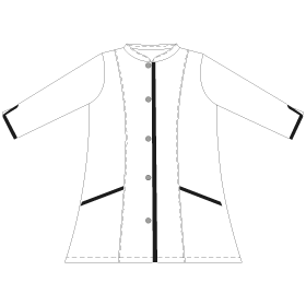 Tunique fermée avec pressions cachées, petit revers manches, rabats décoratifs dans découpe haut devant, découpe taille avec poche côté, petit col et découpe ouverture devant, ceinture amovible. Longueur milieu dos 71cm.