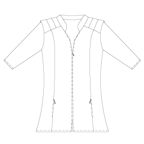 Tunique col V, manches montées. Boutonnage par pressions, calottées au col puis sous patte. 3 poches avec parements. Hauteur 75 cm.