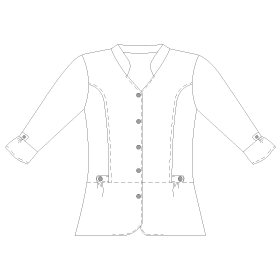 Tunique cintrée, découpe à la taille avec basque. Encolure V et col montant 3/4. Boutonnage milieu devant. Manches 3/4 avec basque. Hauteur 75 cm.