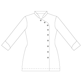 Veste de cuisine femme col Mao, manches longues, bas de manches à revers. Croisure avec boutons pressions calottés.
