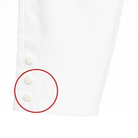 Le bas de jambe est doté d’une fente latérale élégante, fermée par trois pressions, permettant d’enfiler et de retirer le vêtement facilement tout en assurant une excellente tenue.