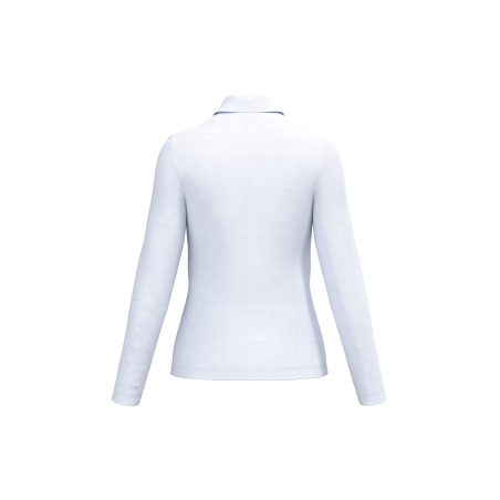 La coupe féminine est élégante sans être restrictive, assurant une grande liberté de mouvement. Les manches longues apportent une couverture supplémentaire, idéale pour les saisons plus fraîches ou les environnements intérieurs climatisés. Le col structuré et la patte de boutonnage ajoutent une touche professionnelle discrète, permettant à ce polo de s’adapter facilement à des tenues casual chic ou plus formelles.
