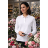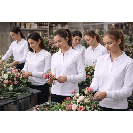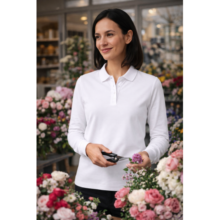 Polo piqué manches longues blanc conçu pour un usage professionnel en entreprise, accueil, commerce ou restauration